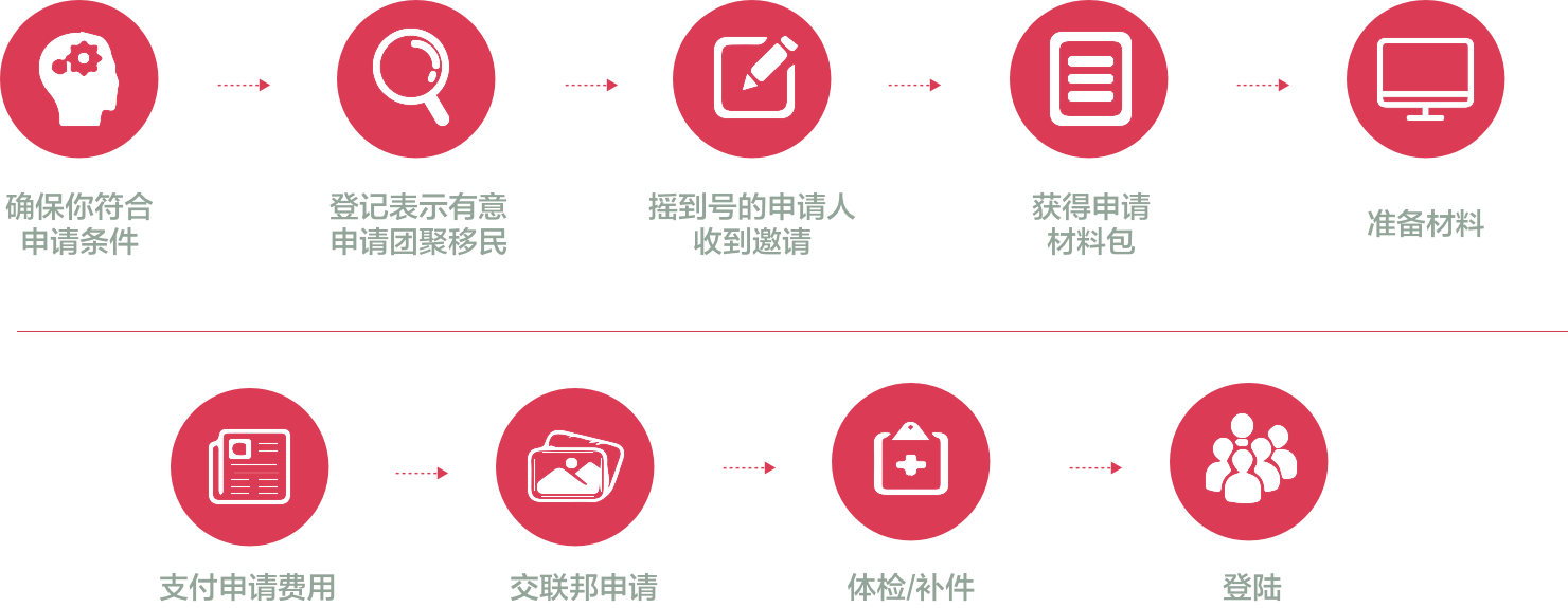 加拿大的家庭团聚移民有:配偶和同居伴侣团聚移民、子女团聚移民、父母/祖父母团聚移民。一、配偶和同居伴侣团聚移民加拿大公民或永久居民可以担保其配偶或同居伴侣移民加拿大。同居伴侣需证明与担保人有至少一年以上的共同生活经历。申请人无学历、工作经验、语言能力或资金证明等要求。二、子女团聚移民担保人可以担保其未满22岁的未婚子女