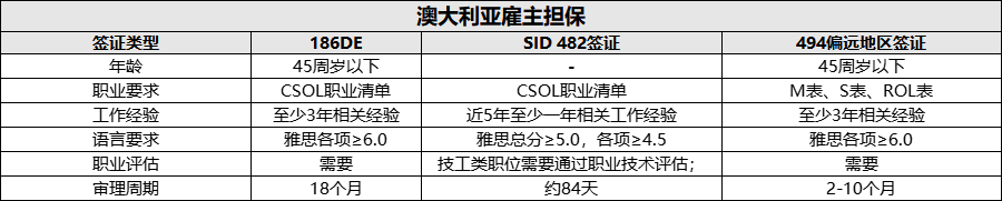 我们知道目前市面上,除了投资移民外,雇主担保项目也是移民的一大主要方式,那今天就这个话题,给大家盘点一下主流移民国家(美加澳新)的雇主担保,对比各个国家的雇主担保项目哪个更适合国人申请。澳大利亚澳大利亚作为国内申请人的理想移民目的地,主流的雇主担保通道有:1、186DE签证适合高技能和管理岗位,申请大致条件:雅思≥6,